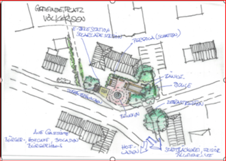 So ergibt sich rechts neben den Haltestellenhäuschen ein neuer einladender Platz unter Bäumen. Dieser Platz sollte der große Ruhepunkt an der alten Schule sein. Der unten in der Skizze rosa dargestellte Bereich würde einen wasserdurchlässigen begehbaren Belag erhalten.