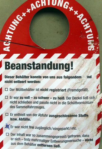 Immer wieder behindern notorische Falschparker die Zufahrt der STEP zu den Müllcontainern, an der letzten Müllstandsfläche am Wendeplatz im Binsenhof. Nach Rücksprache mit der STEP gibt es keine interne Dienstanweisung, wie die Mitarbeiter vor Ort mit Falschparkern, die sie bei der Arbeit behindern, umgehen sollen. Sie können es telefonisch dem Ordnungsamt melden. Dies wird aber meist wegen Wirkungslosigkeit und auch Zeitmangel nicht gemacht. Stattdessen wird der rot-weisse "Beanstandung"-Anhänger an das Falschparker-Fahrzeug gehängt. Diesen fand ich schon einige Male am Boden des Wendeplatzes vor. Frau Platen von der STEP schätzt, dass es stadtweit ca. 20-30 dieser Vorfälle mit Behinderung jeden Tag gibt.