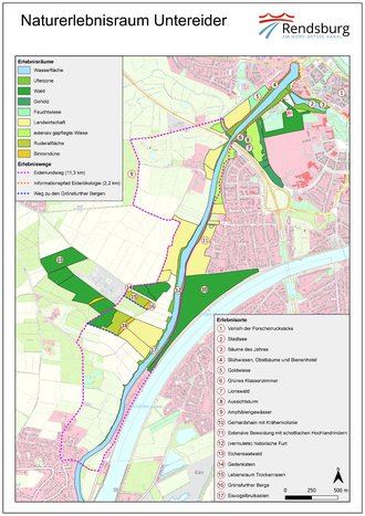 Dieser wundervolle Pfad entlang der Eider ist ein Teilstück des 11,3 km langen Eiderrundweges der zum Naturerlebnisraum Untereider gehört. Hier spenden teilweise Bäume Schatten. In unmittelbarer Nähe liegen das "Grüne Klassenzimmer", der "Lionswald" inkl. dem bereits erwähnten Aussichtsturm, die Weidefläche mit schottischen Hochlandrindern und der Gerhardshain mit der Krähenkolonie.